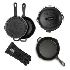 - – 1 poêle en fonte de 25,4 cm de diamètre (long manche + poignée + 2 becs verseurs)